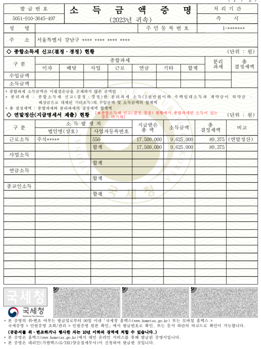 This is an official document issued by the tax office containing individual information. It can be obtained when a company reports an employee's salary to the tax office, or when an individual files their income tax with the tax office.