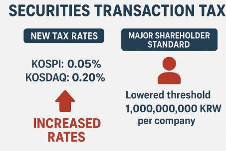 Securities transaction taxes are levied on share transactions. Previously, the rates were 0% for the KOSPI market and 0.15% for the KOSDAQ market. The new rates will be 0.05% for KOSPI and 0.20% for KOSDAQ.