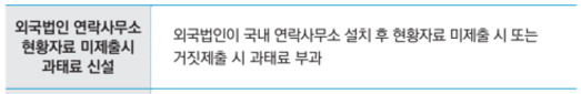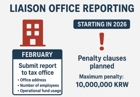 Liaison offices are required to report their current status to the tax office every February, including information such as office address, number of employees, and details of operational fund usage. Previously, there was no penalty obligation to submit this report. However, starting in 2026, penalty clauses are planned to be introduced for non-compliance. The exact penalty amounts have not yet been announced but the maximum penalty amounts are 10,000,000KRW.