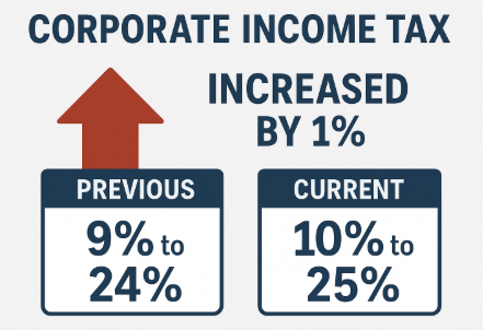 Corporate income tax, which is the tax that corporate businesses pay every March, has recently increased by 1%. Previously, the rates were 9% to 24%, but they have now risen to 10% to 25%. About two years ago, the former government had reduced the rates, and the current government has restored them to the higher range of 10% to 25%.