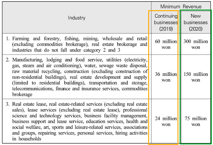 If you started your business this year, your threshold for simplified bookkeeping filing is right side amounts(75/150/300 million) you already have business from last year, your threshold for simplified bookeeping filing is left sides amounts(24/36/60 million).
