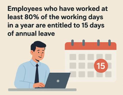 Employees who have worked at least 80% of the working days in a year are entitled to 15 days of annual leave.
