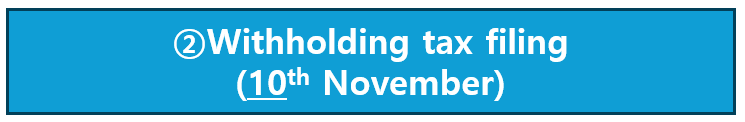 The deadline for filing the withholding tax return is the 10th day of the following month after the payment was made. So, if you paid salaries to your employees in Oct, you must file the withholding tax return by November 10th. (it's usually 10th of following month of the month you paid, but because of the long holiday in this month, it's extended to 15th)
