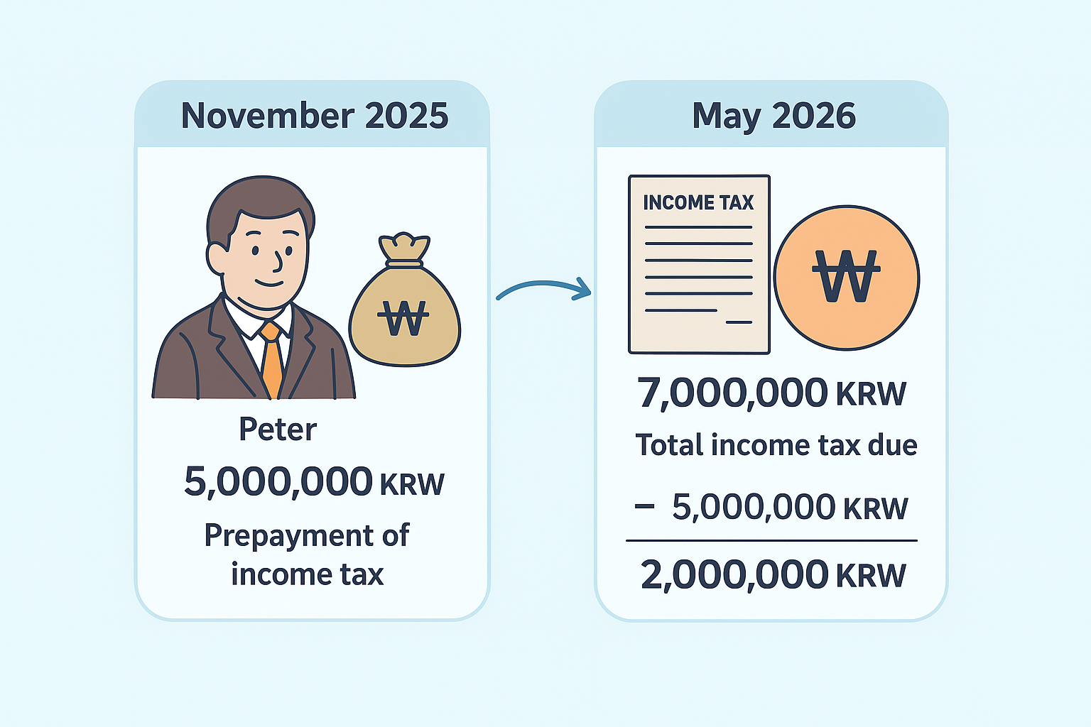 For example, if an individual business owner named Peter pays 5,000,000 KRW as interim tax in November 2025, and his final income tax liability calculated in May 2026 is 7,000,000 KRW, he can deduct the already paid 5,000,000 KRW and pay only the remaining 2,000,000 KRW.
