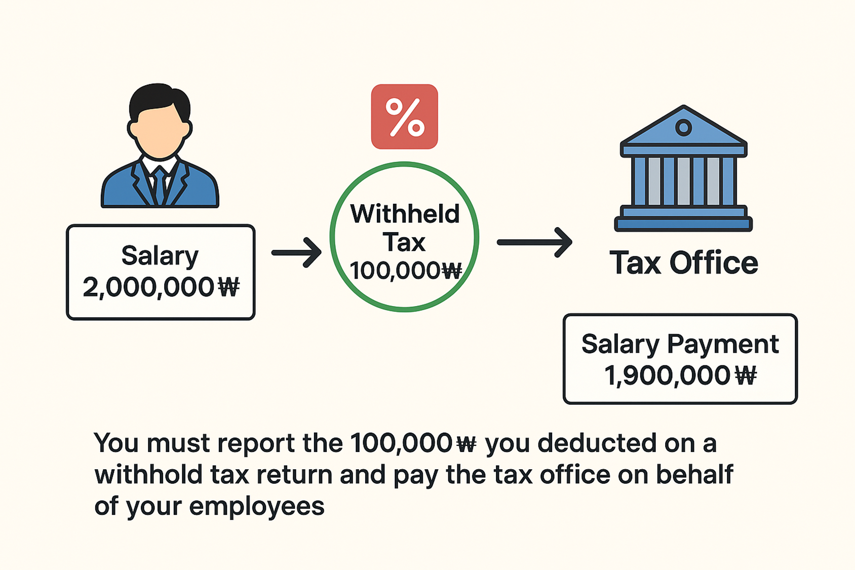 *For example, if your employee has a contracted salary of 2,000,000 KRW, you must deduct 100,000 KRW for taxes, and pay your employee 1,900,000 KRW. The 100,000 KRW you deducted must be reported on a withhold tax return and paid to the tax office on behalf of your employees.