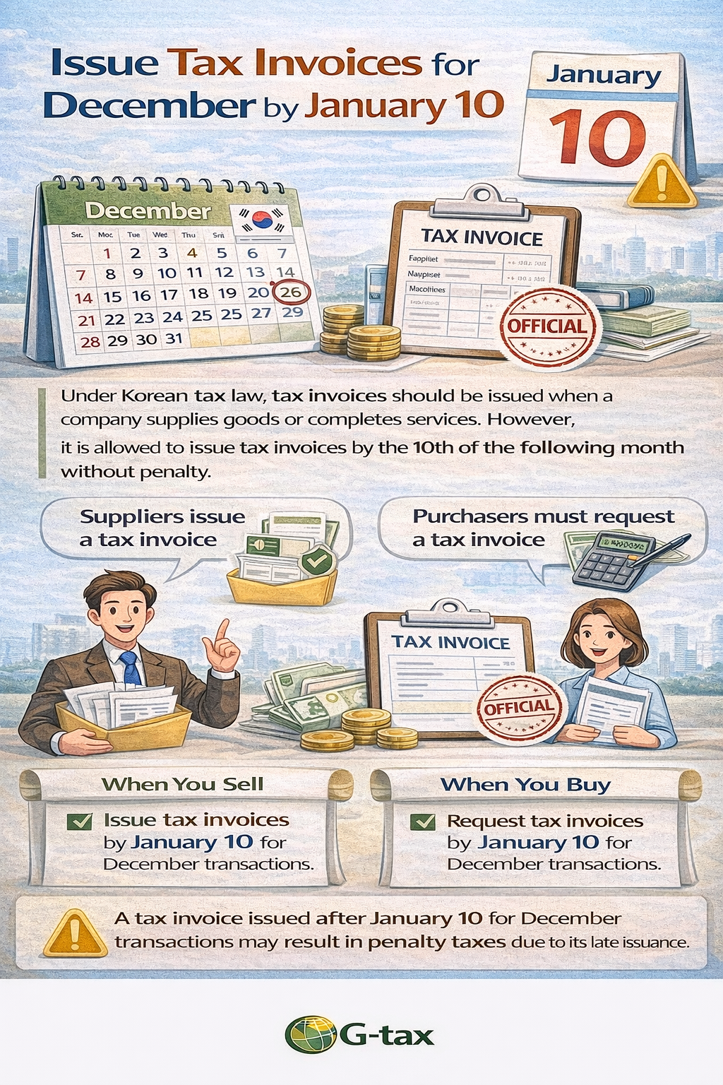 A tax invoice should be issued when a company supplies goods or completes services.However, under Korean tax law, it is allowed to issue the tax invoice by the 10th of the following month.