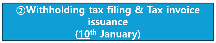 *For example, if your employee has a contracted salary of 2,000,000 KRW, you must deduct 100,000 KRW for taxes, and pay your employee 1,900,000 KRW. The 100,000 KRW you deducted must be reported on a withhold tax return and paid to the tax office on behalf of your employees.
