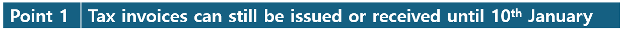 Therefore, if you supplied goods or services in December and did not issue a tax invoice at that time, you can still issue it by January 10. If the tax invoice is issued after January 10 for December transactions, penalty taxes may apply due to late issuance.