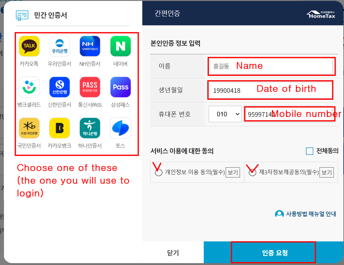3-2.If you do not have a personal digital certificate, click “Simple Authentication (간편인증)” and choose one of the available applications to log in. Then, enter your name, date of birth, and mobile number, and click “Request Authentication (인증요청)”.