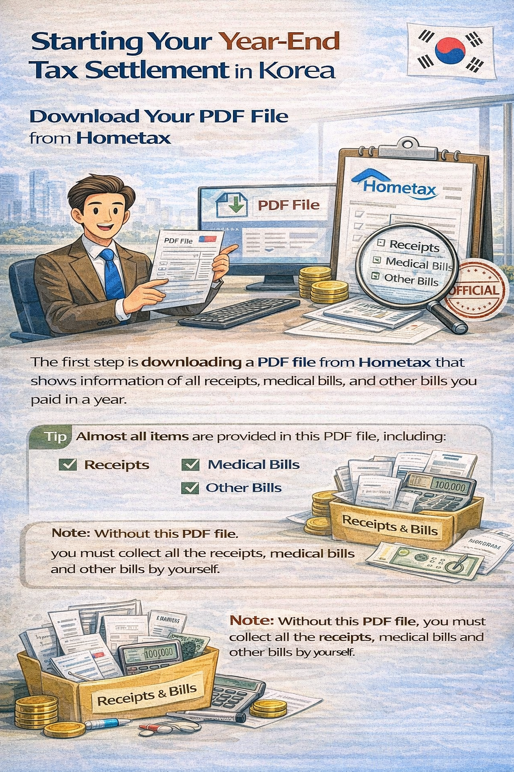 To start your year-end tax settlement in Korea, the very first thing you should do is to download ‘the PDF file’ from home tax. The PDF file shows information of all receipts,medical bills and other bills you paid in a year.