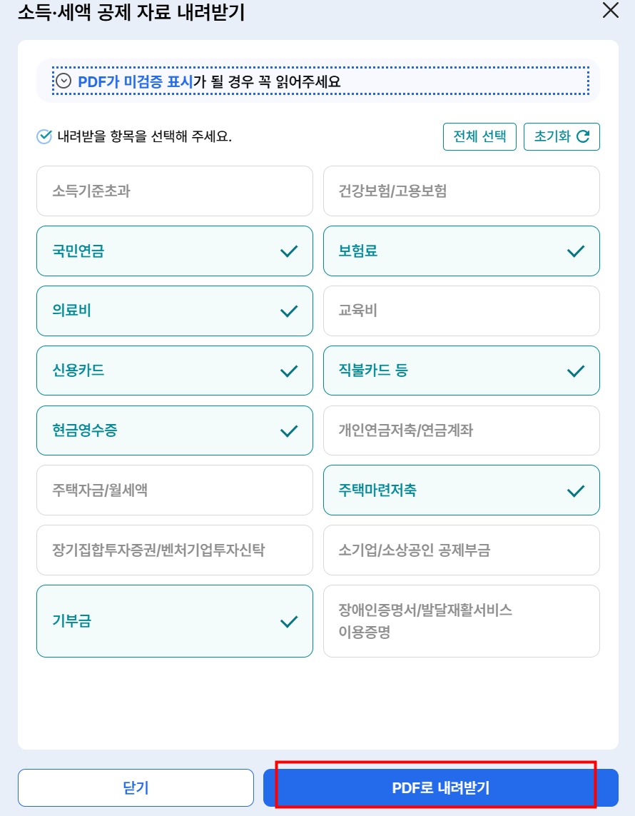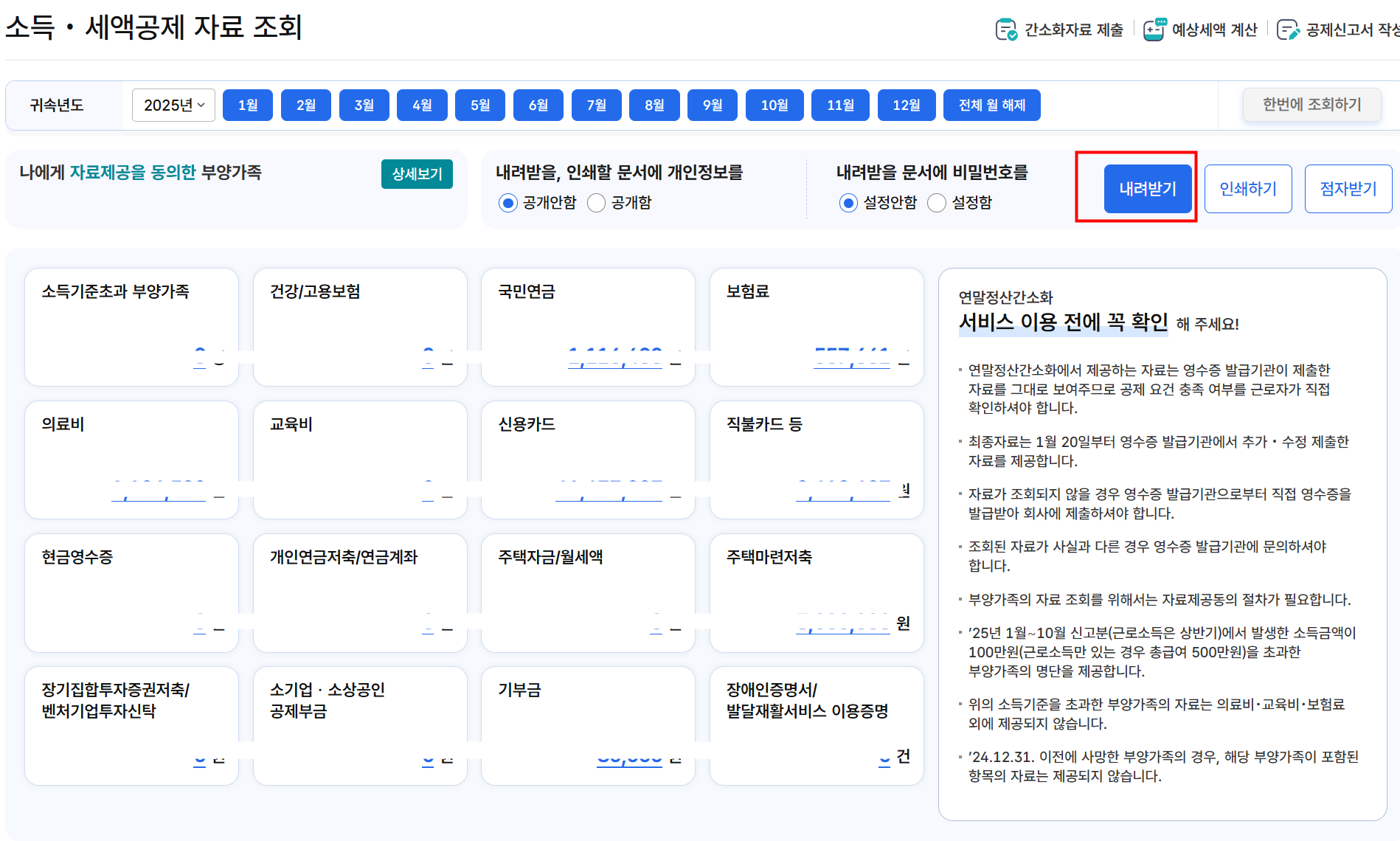 6. After reviewing the amounts for each deduction item, click “Download (내려받기)”.