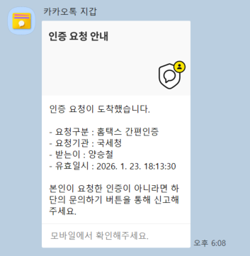 Then, you will receive an authentication notification from the app you selected (for example, I chose KakaoTalk). Proceed with the authentication and press “Complete Authentication (인증완료)