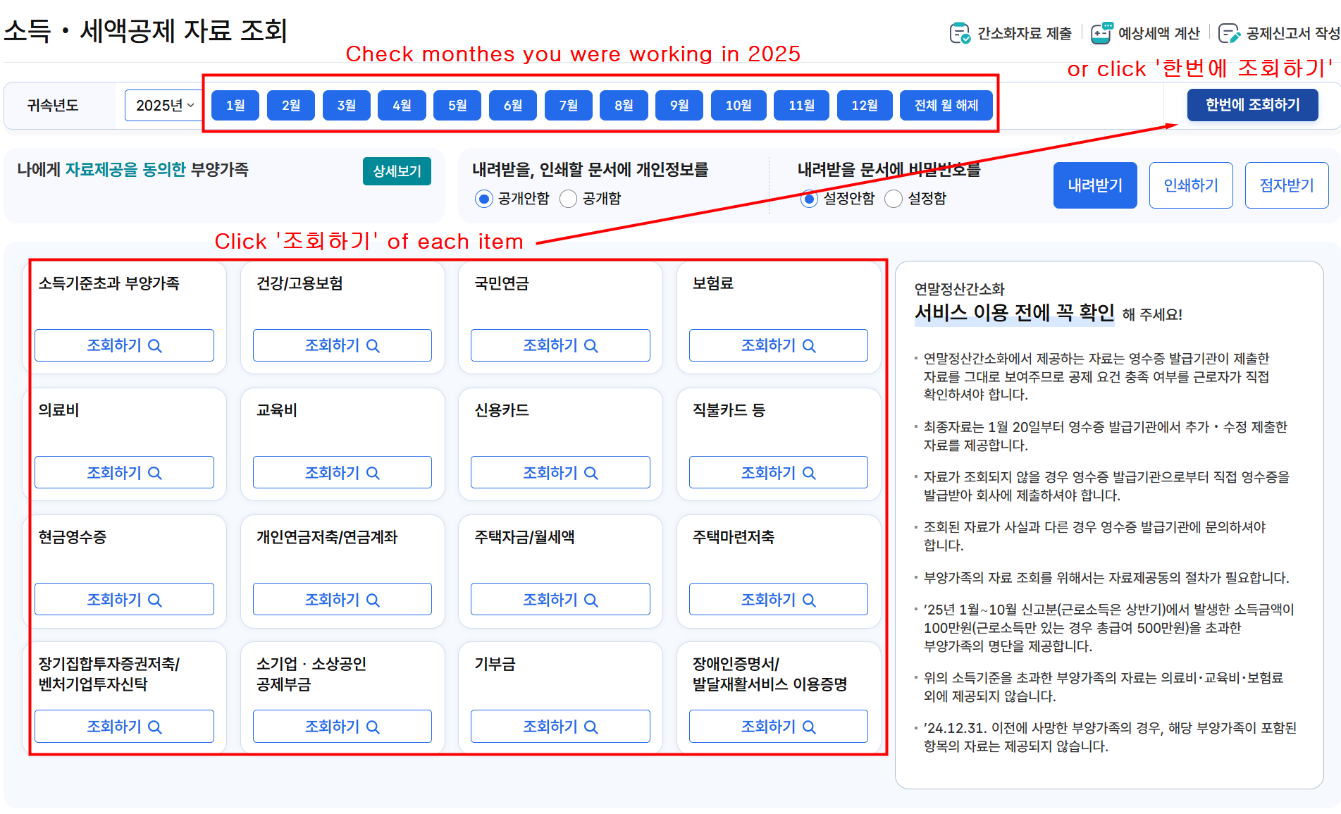 5. Select the month(s) you worked in 2025, and click “Search (조회하기)” for each deduction item. Alternatively, you can click “Search All at Once (한번에 조회하기)” to view all items together.