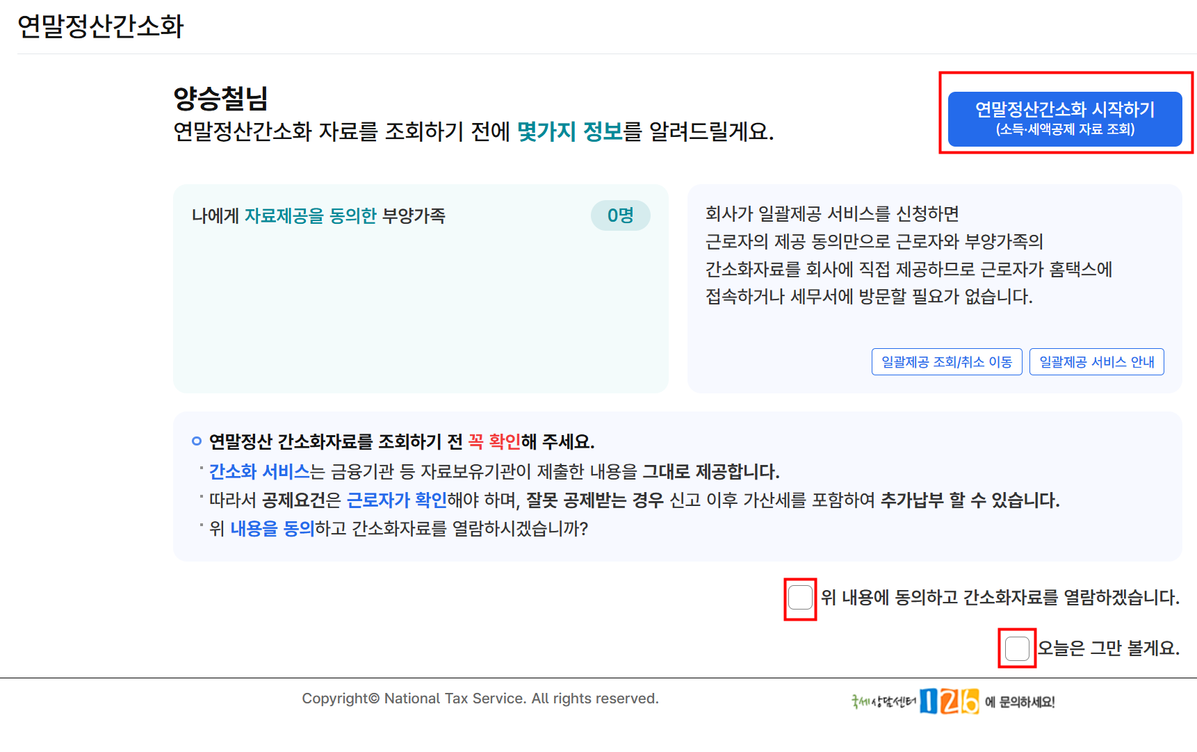 4. After checking the boxes below, press “Start Year-End Tax Settlement Simplification (연말정산 간소화 시작하기)”.
