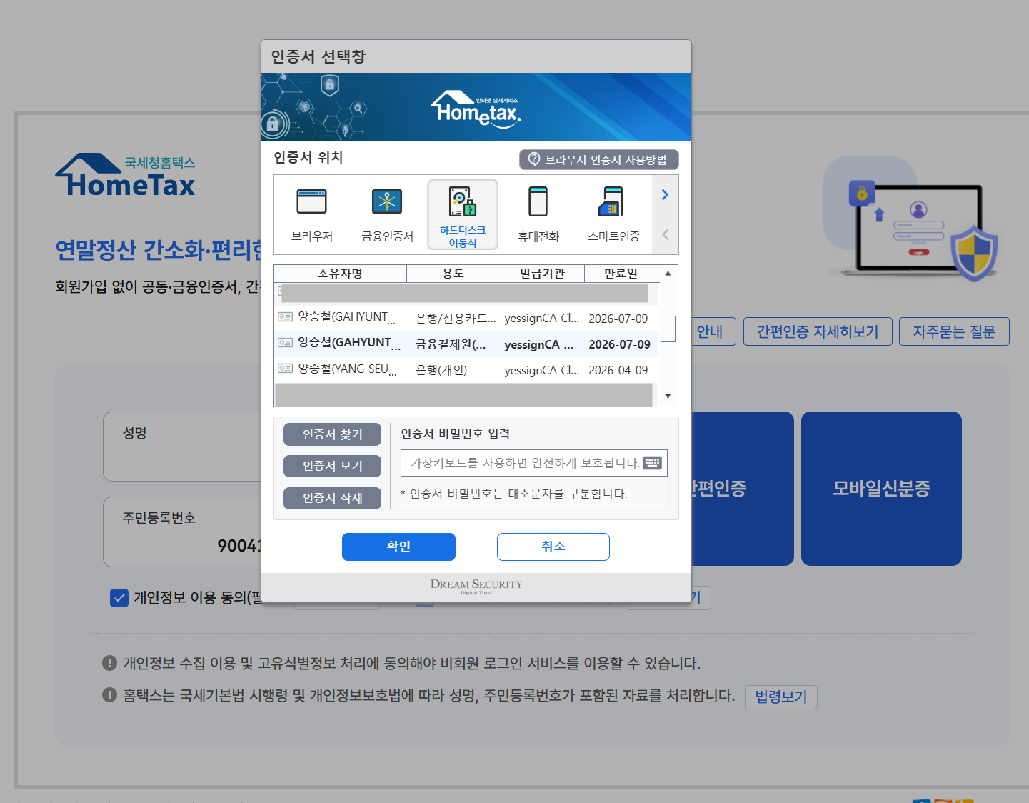 First, enter your name and registration number on the left-hand side, then click one of the following options: 공동,금융인증 / 간편인증 / 모바일신분증
