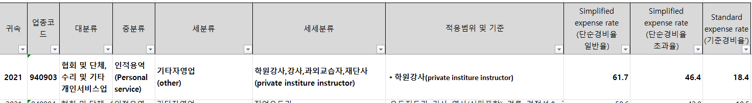 *When you use standard expense rate, you can deduct rent, payroll cost, cost of sales. but typically, english teacher don't have payroll cost or cost of sales. only rent could be deductible(if you pay rent) so this examples, we assume it 10,000,000 KRW