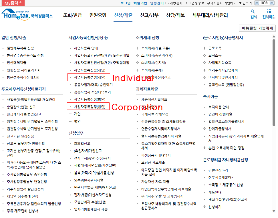 2.Click 신청/제출 -> 사업자등록 정정(개인 or 법인)
