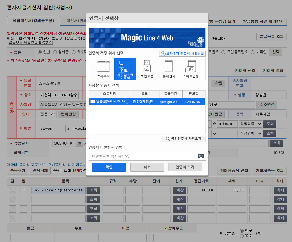 Once you've followed these steps and entered your digital certificate password, you've successfully issued a tax invoice. To review your issuance history, you can navigate to the '전자세금계산서 조회' (Electronic Tax Invoice Inquiry) tab.