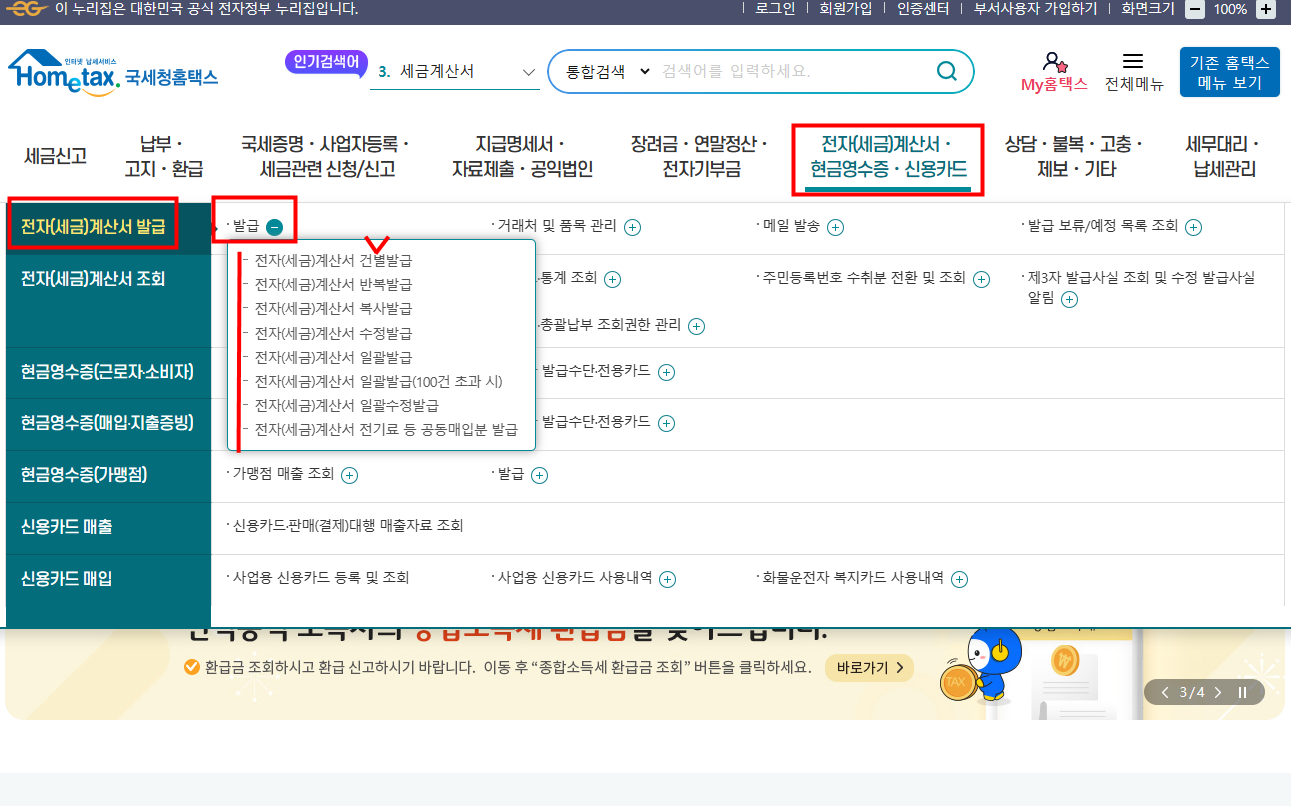 3.Click '전자(세금)계산서.현금영수증.신용카드 -> 전자세금계산서 발급 -> '발급'