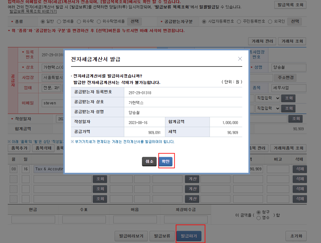 6.Once you've completed all the necessary information and clicked '발급하기' (Issue), a pop-up will appear. Please proceed by clicking '확인' (Confirm) to initiate the issuance process.