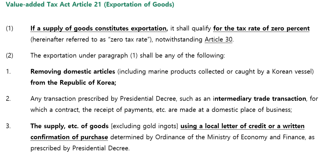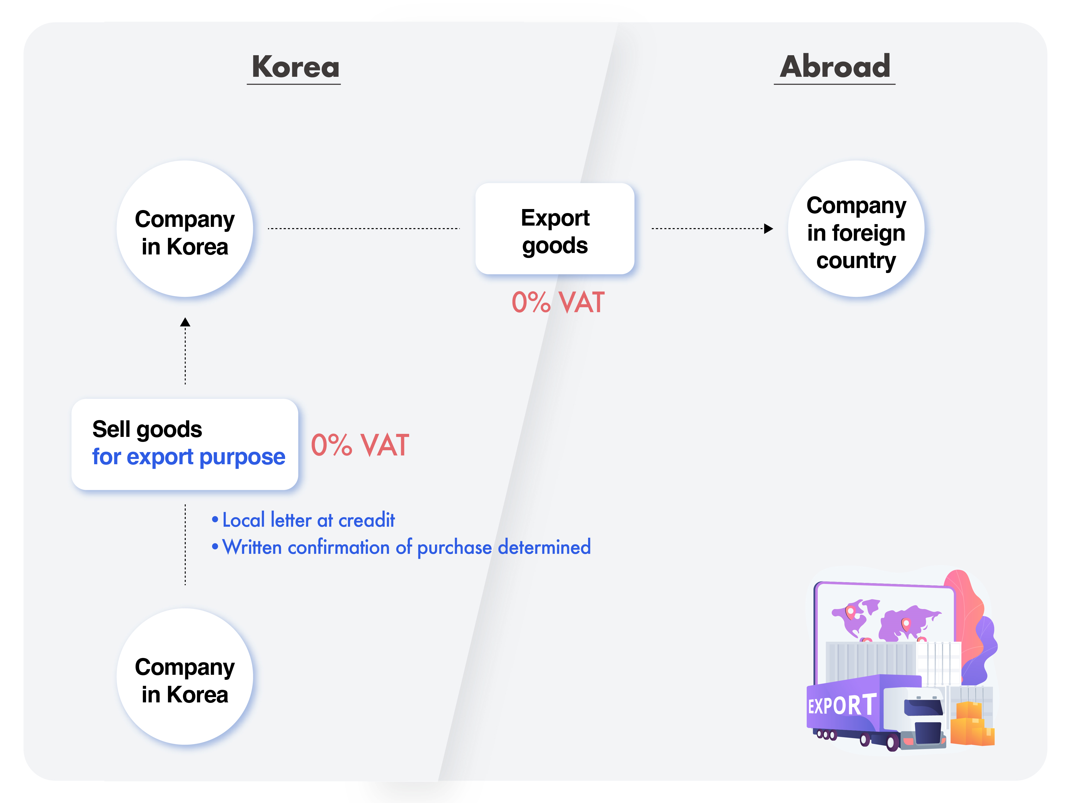 2.When goods are supplied to an export company, and that company subsequently exports them outside of Korea, the supply of goods can be eligible for a 0% VAT tax rate.