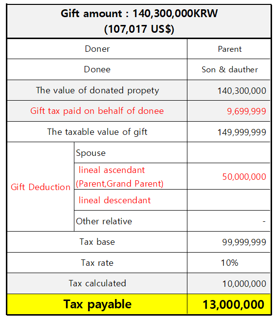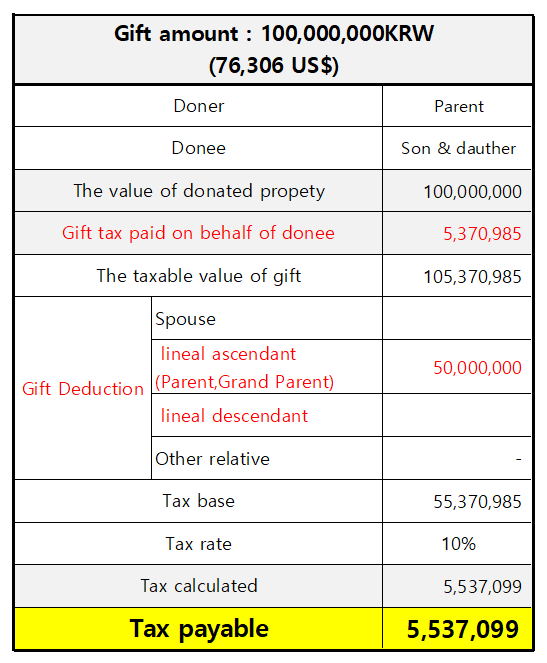 If the gift amount is 100,000,000 KRW, which exceeds the basic deduction of 50,000,000 KRW, taxes would apply. When the parent pays the taxes on behalf of their children, the total tax payable amounts to 5,537,09 9 KRW.