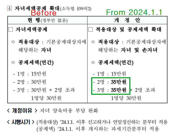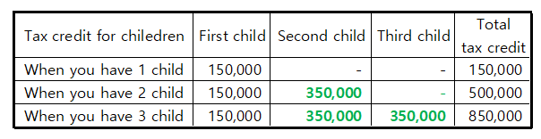 During personal income tax filing, employees can claim tax credits for their children. the amounts has been raised to 350,000KRW from the previous 300,000KRW. This increase applies when you have second and third child.