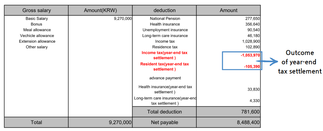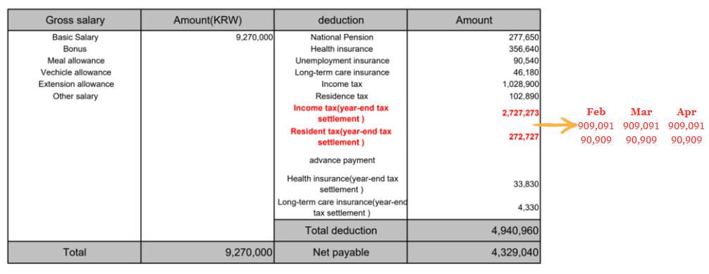 For example, if your normal salary is 9,270,000 KRW and the tax payable by year-end settlement is 3,000,000 KRW, your February salary would be much less than normal month.
