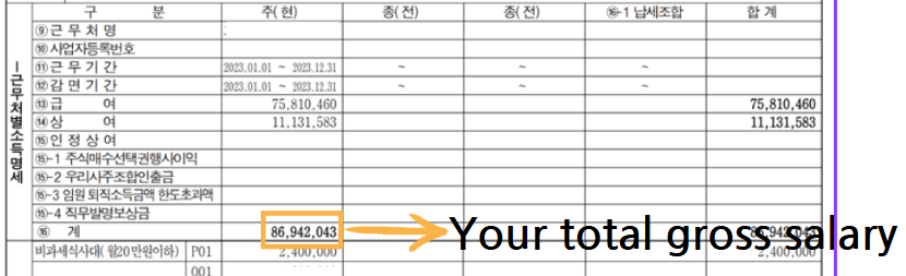 This is crucial because, based on this amount, it will be determined whether you need to pay additional taxes or receive a tax refund. (In this example: 8,023,640 KRW)