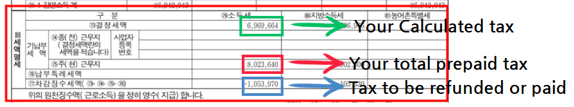 It is calculated by subtracting the prepaid taxes from the calculated taxes. If the amount is (-)negative, you will receive a refund. However, if it is (+) positive, you will need to pay additional taxes. (In this example: -1,053,970 KRW *which menas it will be refunded)