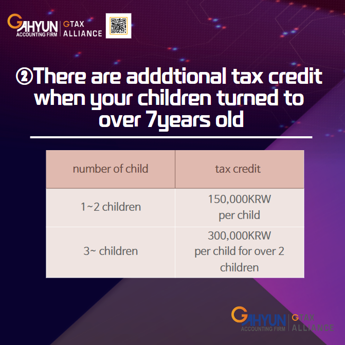 Tax credit for your children is possible when your children become over 7years old. As same as the tax credit of birth, here is also differential depending on the number of children.
