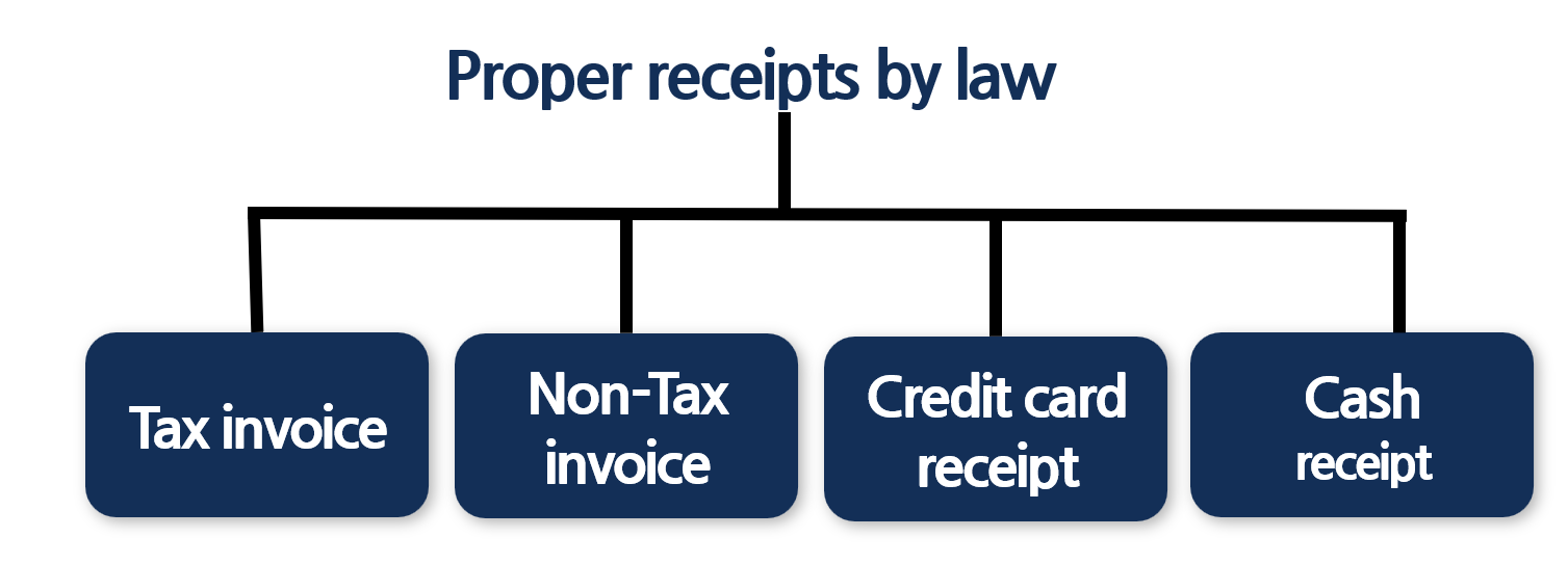 There are four types of legally recognized receipts: tax invoices, non-tax invoices, credit card receipts, and cash receipts.