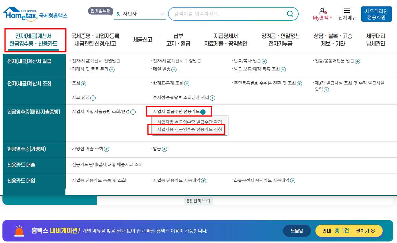 Registering your credit card on Hometax can save you the hassle of collecting receipts. Follow the steps below to get started 1.Search ‘Hometax’ 2.Click '전자(세금)계산서, 현금영수증, 신용카드 -> Click '사업용 신용카드 등록