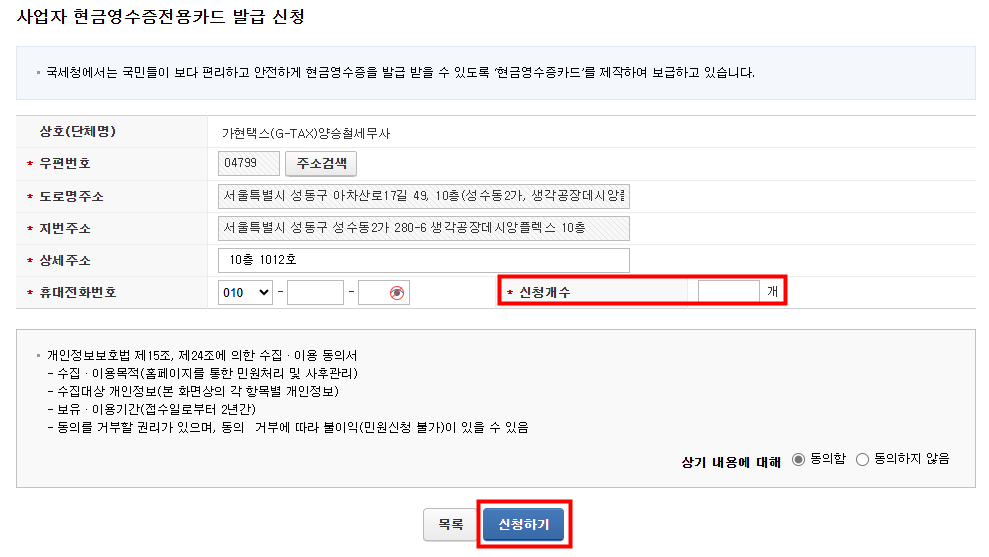 You can set the number of cards you need and click '신청하기' to request them. The cards will be delivered to your business address, and it's free!