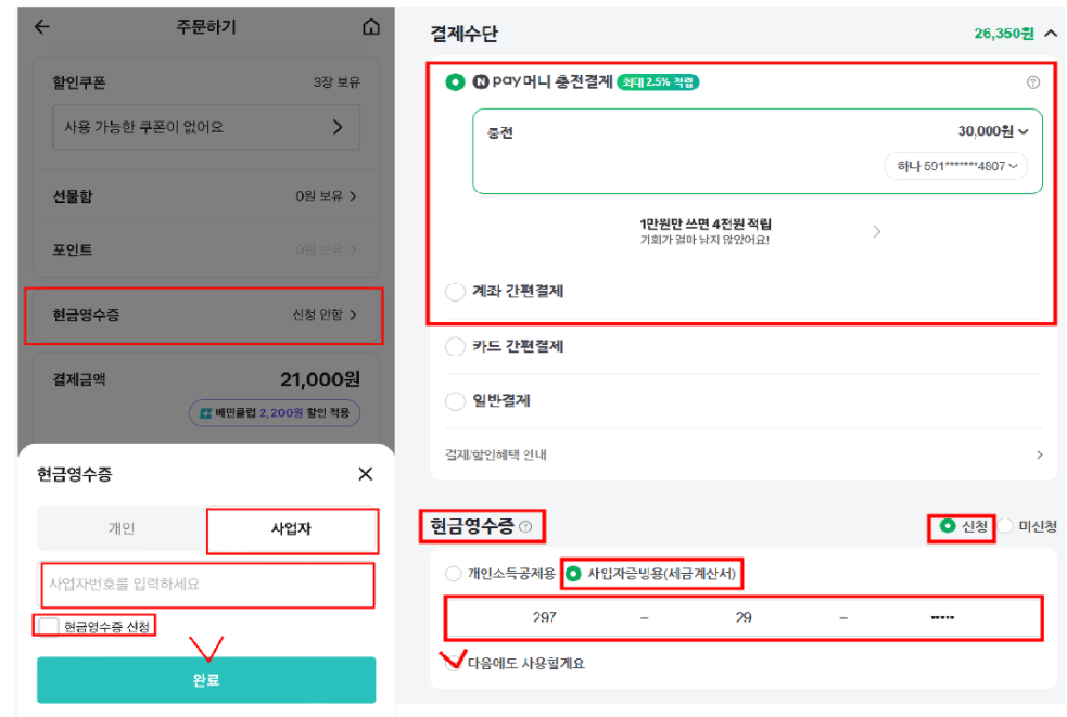 Below are examples of paying through a delivery app (Baemin) and Naver Pay. As you can see, you should choose the option for a cash receipt for business costs (사업자증빙용).