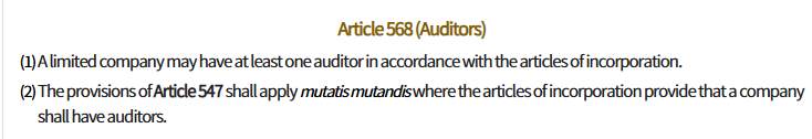 Stock company should appoint an auditor(this auditor is different with external auditor for audit) for the establishement process. when stock company's capital amounts are below 1billion KRW, stock company don't need to appoint an auditor. so, typically when first establish stock company they appoint auditor for the establishement process and after that if the company's capatal amoutns are below 1billion, do the process of resigh of auditor.