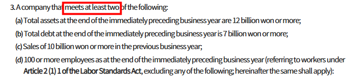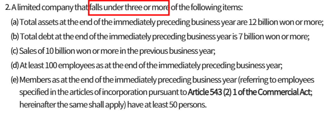 This means that Limited Companies have a bit more flexibility regarding the external audit obligation. For example, if a company's total assets exceed 12 billion KRW and sales exceed 10 billion KRW, a Stock Company would be required to undergo an audit. However, a Limited Company would need to meet at least one additional criterion before being subject to the same audit requirement.