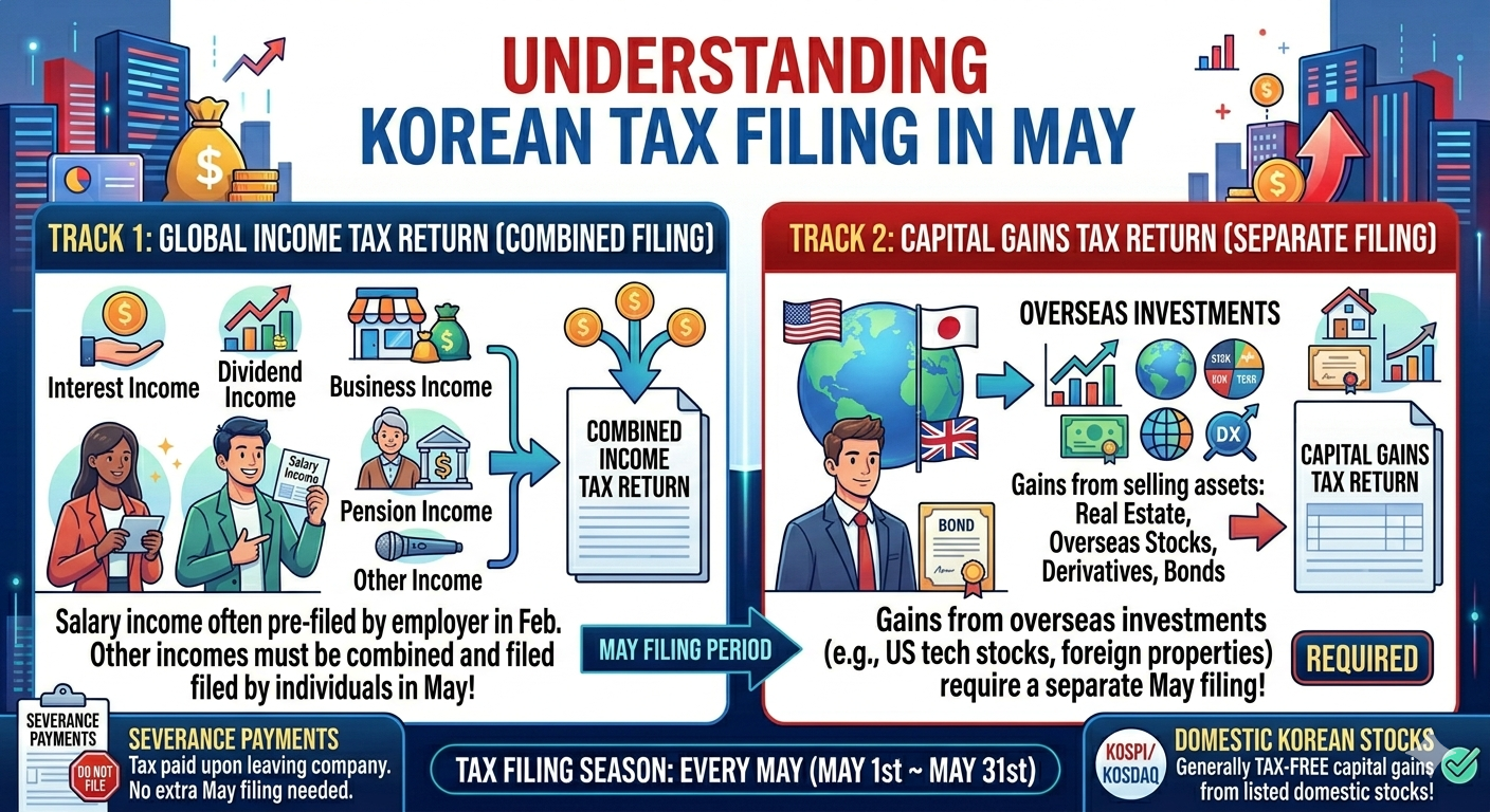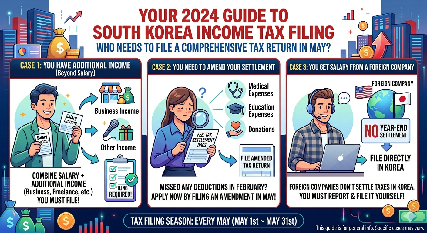 Under Korean tax law, any resident (regardless of nationality, meaning that even foreigners can be considered residents in Korea) who earned income during the previous year (from January 1 to December 31) is required to file an income tax return and pay any applicable taxes by the end of May.