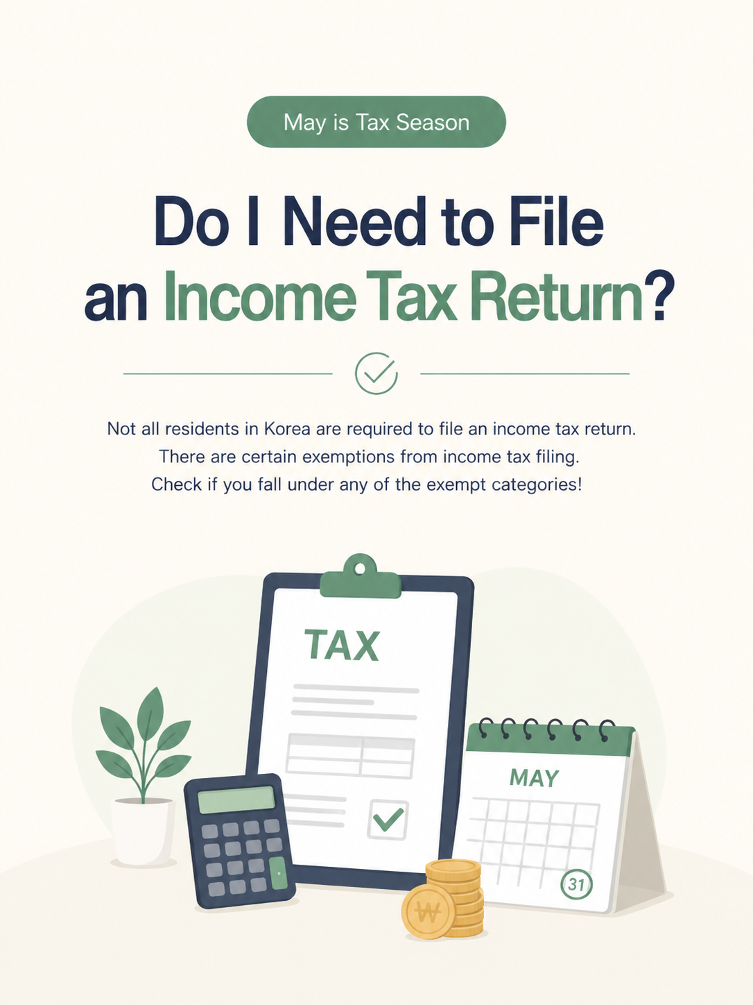 However, not all residents are required to file an income tax return. There are certain exemptions from income tax filing. Therefore, if you fall under any of the categories below, you are not required to file an income tax return in Korea.