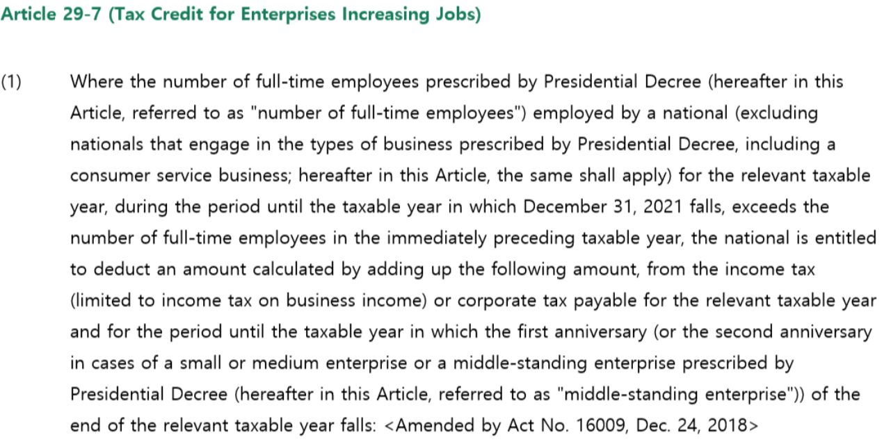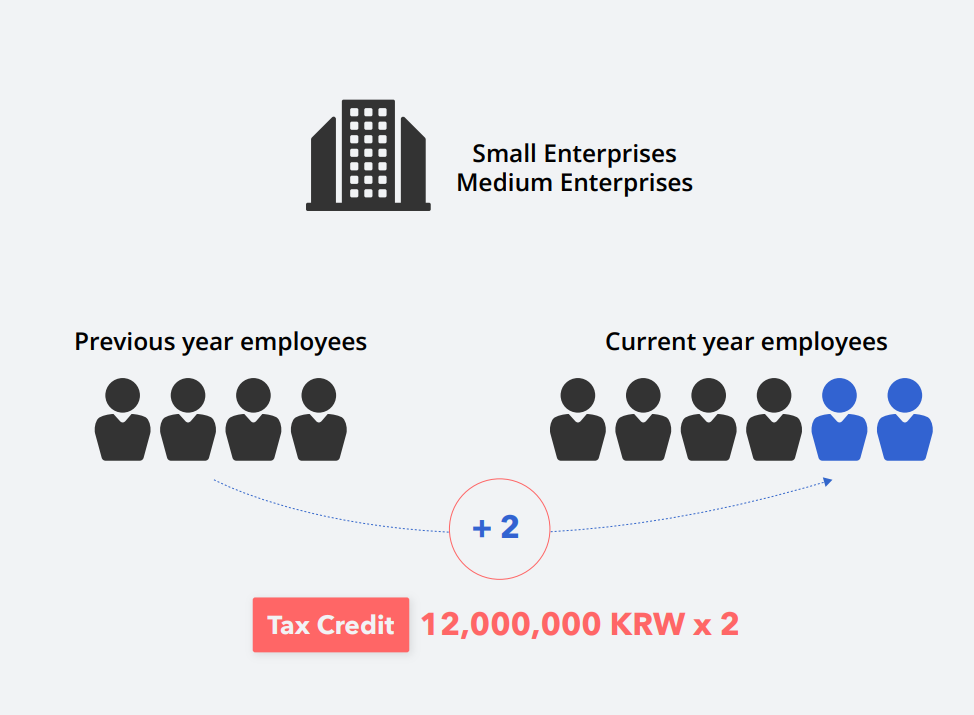 You can receive up to 12,000,000KRW (approximately 10,000USD) in tax credits for each employee you've hired in comparison to the previous year.This translates to a reduction of 12,000,000KRW in your tax liability.