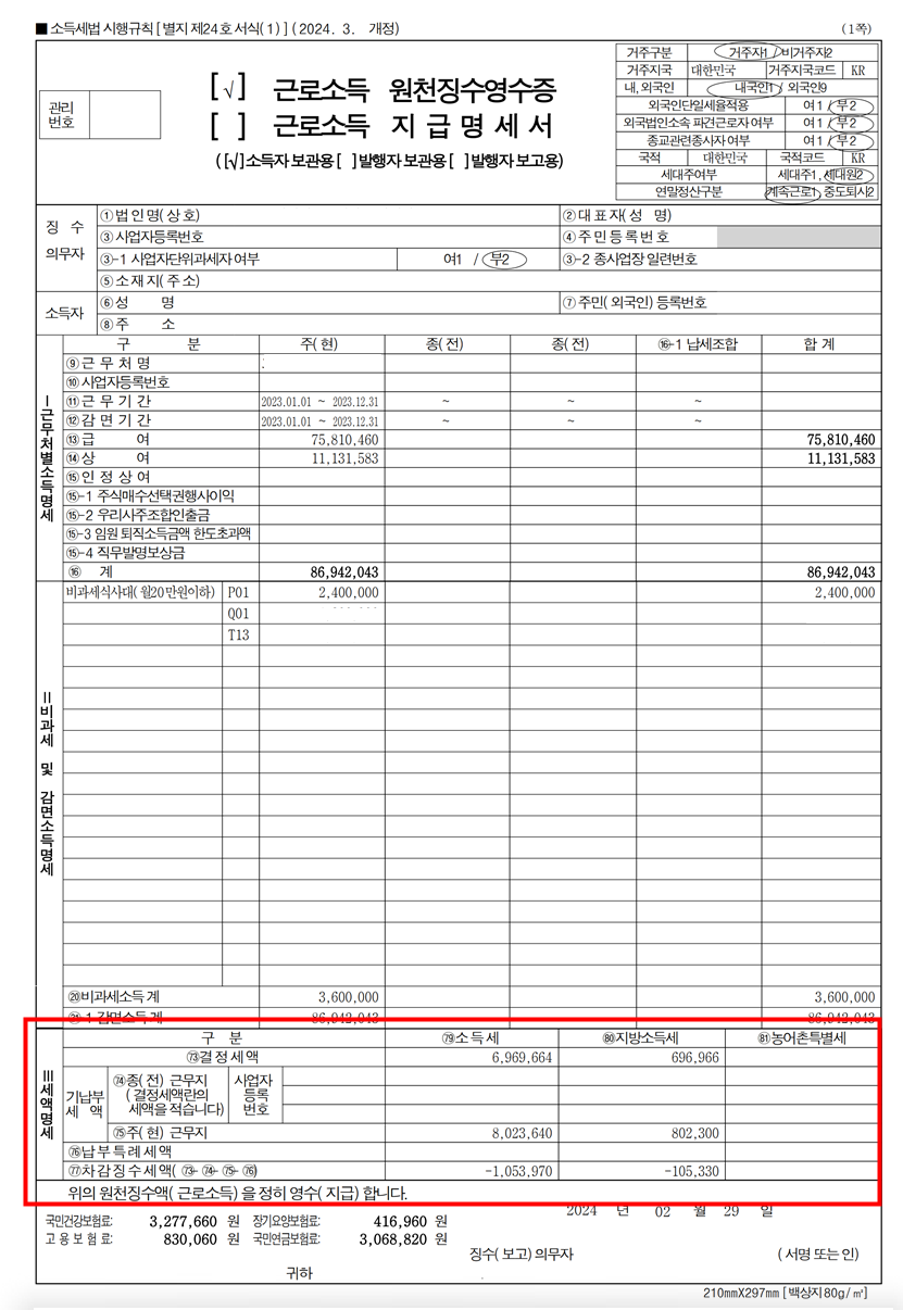 This is crucial because, based on this amount, it will be determined whether you need to pay additional taxes or receive a tax refund. (In this example: 8,023,640 KRW)